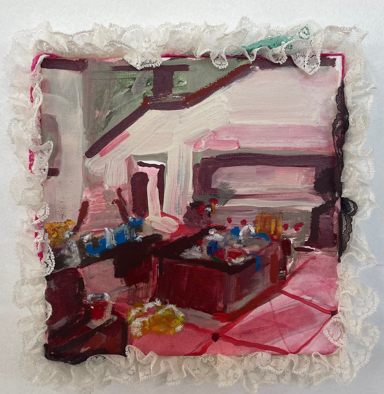 | Medium | Paint and Oil Pastel on Stretched Canvas, with Lace Additions |